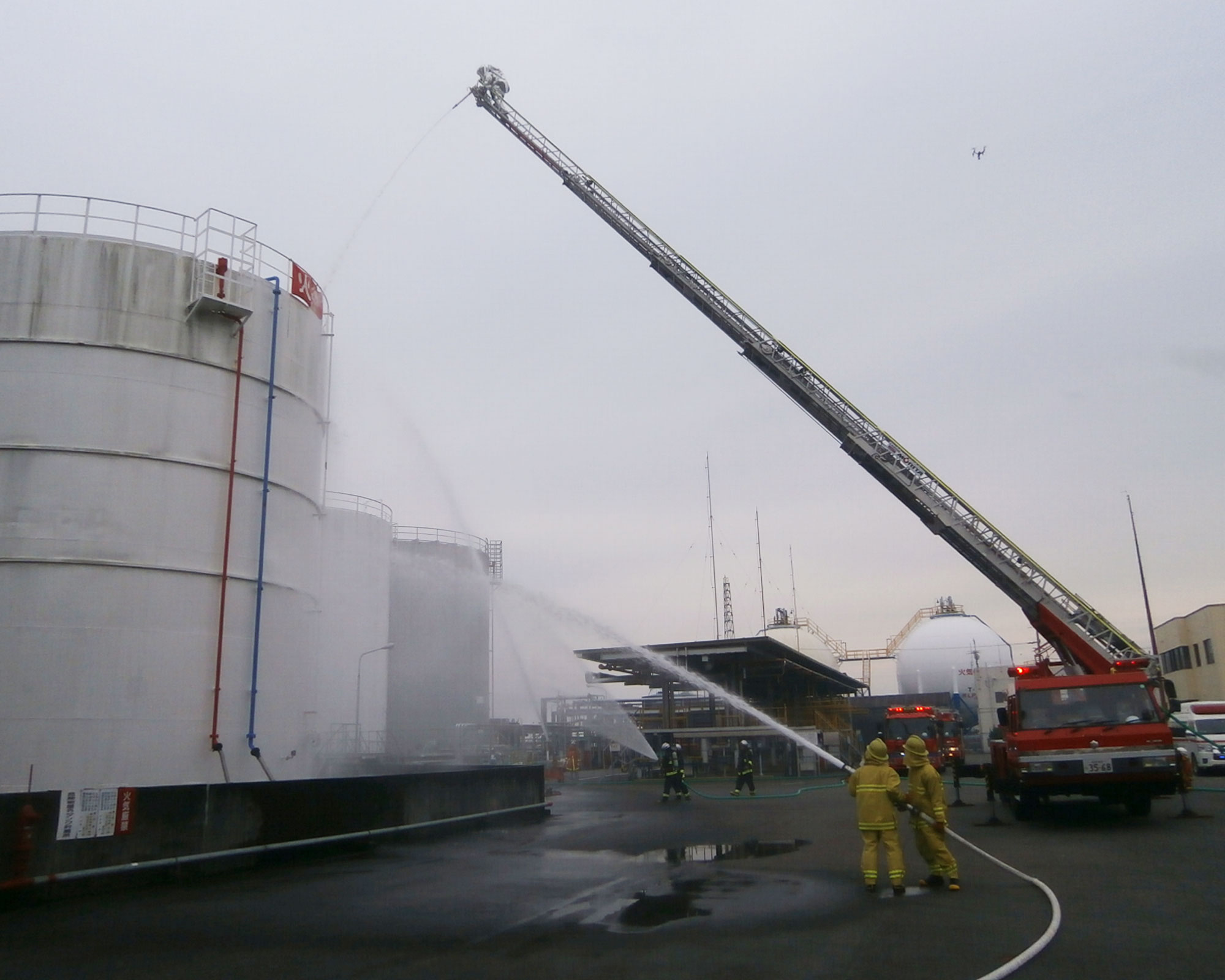 今年度は「石油タンク検査のため残油を抜き取り中に何らかの原因で火災が発生、負傷者も発生した。また、タンク屋根板も破損している」という想定で同社の自衛消防隊と振興会応援隊、志太消防本部、市危機管理部の59名が参加し、通報・救護・消火・交通規制訓練など、実践的な訓練と、緊急連絡網による情報伝達訓練を行い、58社が参加しました。